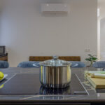 The living room, seamlessly connected to the kitchen, offers a large chaise longue sofa in neutral tones and a big flat-screen TV, perfect for moments of rest and entertainment. The entire apartment is soundproofed, has air conditioning in all rooms, and is fitted with high-quality windows that ensure peace and comfort at all times, despite being located on the ground floor. The flooring adds warmth and elegance, while the decorative details — such as plants, warm-toned furniture, and carefully placed lighting — create a cozy and truly luxurious Mediterranean atmosphere.