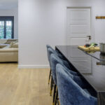 The open-concept kitchen is a true masterpiece of contemporary design. Fully equipped with all necessary appliances, it features a dark countertop, a breakfast bar with elegant stools, and blue ambient lighting that gives it an exclusive touch — the perfect spot for leisurely breakfasts or a sophisticated dinner.