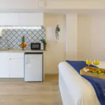 The kitchen is simple yet fully equipped, perfect for short and medium stays. It features a small fridge, two-ring hob, microwave, and all the necessary kitchenware, allowing guests to prepare meals with ease.