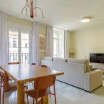 La vivienda dispone de dos dormitorios, uno principal con cama de matrimonio y un segundo dormitorio con dos camas individuales, ambos diseñados para ofrecer confort y tranquilidad, y cuenta además con dos cuartos de baño completos, uno con ducha y otro con bañera, modernos y funcionales, que aportan comodidad y privacidad durante la estancia. El amplio salón-comedor es uno de los grandes atractivos del apartamento: un espacio luminoso y bien distribuido que incluye una gran mesa de comedor, una cómoda zona de descanso con sofá y televisión, y un espacio habilitado para teletrabajo, ideal para estancias largas o para quienes necesitan trabajar durante su viaje.