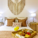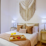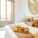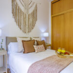 El apartamento, con un dormitorio amplio y luminoso, destaca por su decoración cálida y cuidada al detalle. Tonos neutros, textiles naturales y piezas de inspiración mediterránea crean un ambiente relajante y acogedor, ideal para descansar después de recorrer Málaga. La cama doble, perfectamente vestida y acompañada de iluminación suave, aporta una sensación de serenidad absoluta.
