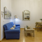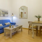 El salón, decorado con muebles de estilo rústico-chic y colores armónicos, ofrece un espacio cómodo para relajarse, leer o disfrutar de una cena tranquila. La armonía visual y la luz natural convierten esta estancia en un refugio encantador dentro del bullicioso centro de Málaga.